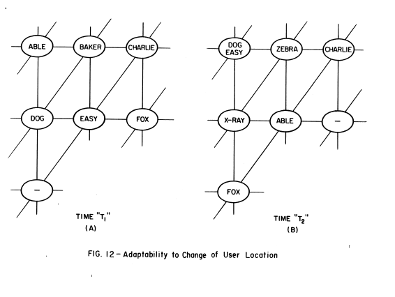 This simple simultaneous learning and forgetting mechanism implemented independently at each node causes the entire network to suggest the appearance of an adaptive system responding to gross changes of environment in several respects, without human intervention. For example, consider self-adaptation to station location. A station, Able, normally transmitted from one location in the network, as shown in Fig. 12(a). If Able moved to the location shown in Fig. 12(b), all he need do to announce his new location is to transmit a few seconds of dummy traffic. The network will quickly learn the new location and direct traffic toward Able at his new location. The links could also be cut and altered, yet the network would relearn. Each node sees its environment through myopic eyes by only having links and link status information to a few neighbors. There is no central control; only a simple local routing policy is performed at each node, yet the overall system adapts.