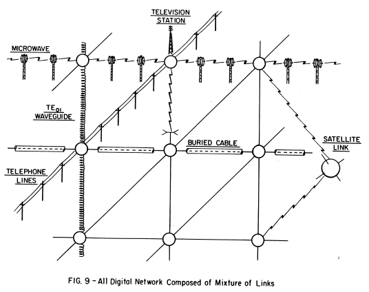 A key attribute of the new media is that it permits formation of new routes cheaply, yet allows transmission on the order of a million or so bits per second, high enough to be economic, but yet low enough to be inexpensively processed with existing digital computer techniques at the relay station nodes. Reliability and raw error rates are secondary. The network must be built with the expectation of heavy damage, anyway. Powerful error removal methods exist.
